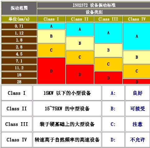 通過測量旋轉(zhuǎn)機(jī)械振動(dòng)的速度,將其與振動(dòng)烈度判據(jù)(10Hz~1kHz)-ISO2372標(biāo)準(zhǔn)相比對便可得知設(shè)備的運(yùn)行狀態(tài)。