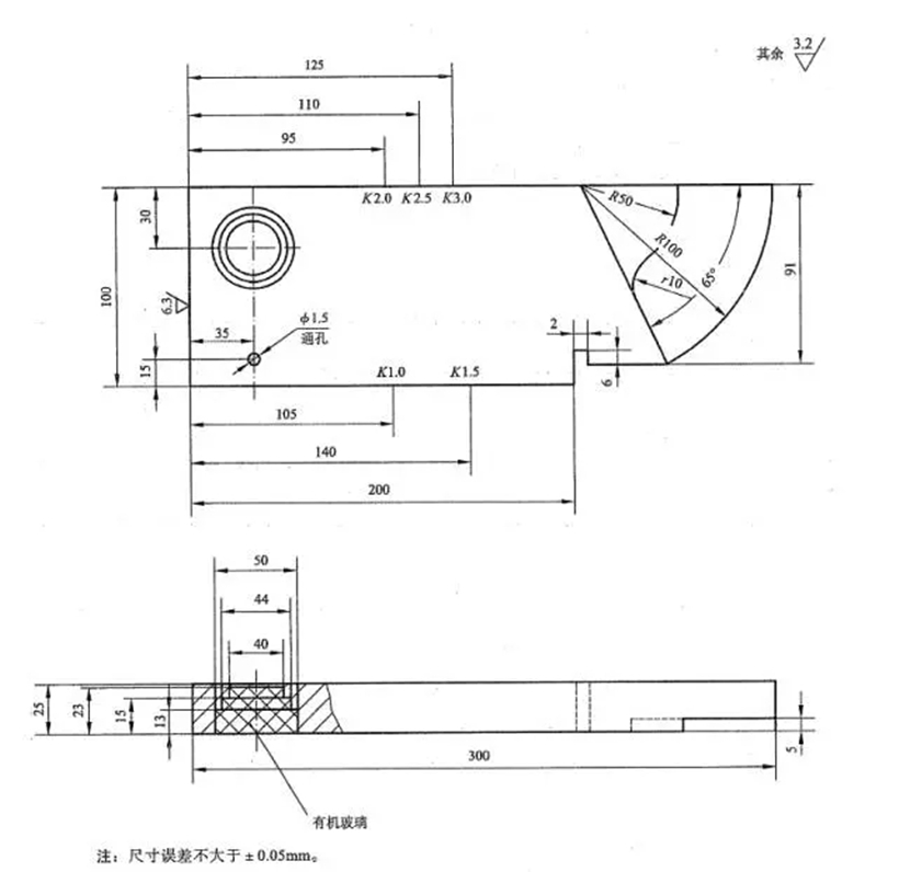 CSK-IA試塊是我國承壓設(shè)備無損檢測標(biāo)準(zhǔn)NB/T47013中規(guī)定的標(biāo)準(zhǔn)試塊,其結(jié)構(gòu)尺寸如圖所示。