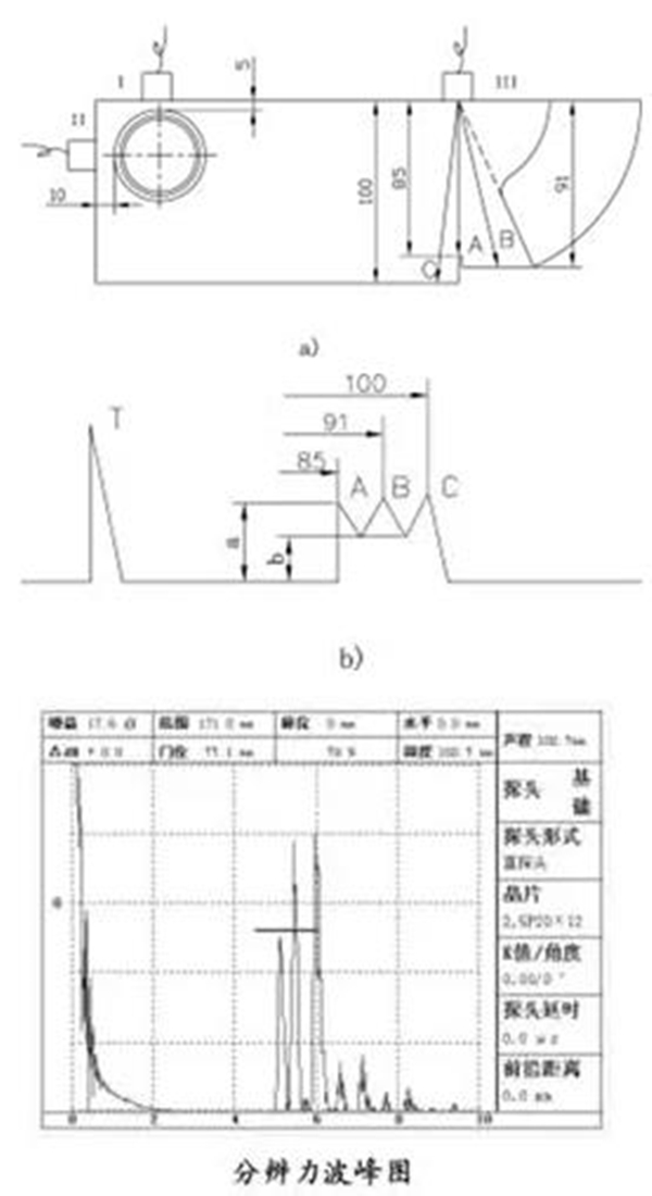 在利用縱波探傷時,可以利用試塊的已知厚度來調(diào)整探測范圍和掃描速度,此過程我往往和檢驗時基線性同步進(jìn)行。當(dāng)探測范圍在250mm以內(nèi)時,可將探頭置于25mm厚的大平底上,使四次底部回波位于刻度四,十次底部回?fù)芪挥诳潭仁?,則刻度十就代表實(shí)際探測聲程為250mm。當(dāng)探測聲程范圍大于250mm時,可將探頭置于如圖的B或C處,使各次底波位于相應(yīng)的刻度處,此時起始零點(diǎn)亦同時得到修正。