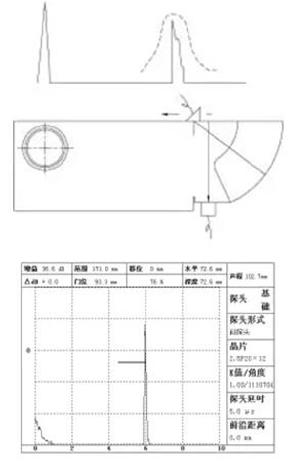 根據(jù)AVG原理,在探頭探傷時可把R100mm圓弧面視為大平底反射,以此來調(diào)整探測靈敏度。直探頭探傷時可把厚度為25/100mm的幾個側(cè)面視為大平底處理,以此來調(diào)整靈敏度。另外,也可以根據(jù)探傷要求,儀測量1.5mm橫通孔反射波來確定靈敏度。