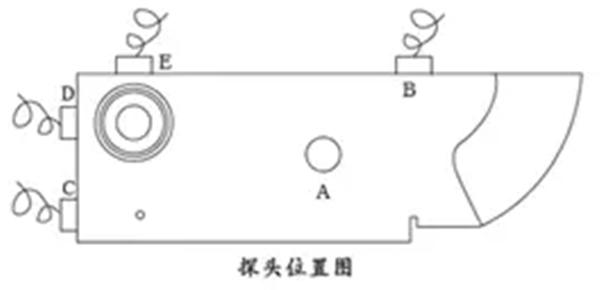 盲區(qū)是指最小的探測距離,測試方法是:將直探頭置于探頭位置圖中D、E位置,測量50mm圓孔反射波。從而可以估計出盲區(qū)小于等于5mm或大于等于10mm,或者介于兩者之間。
