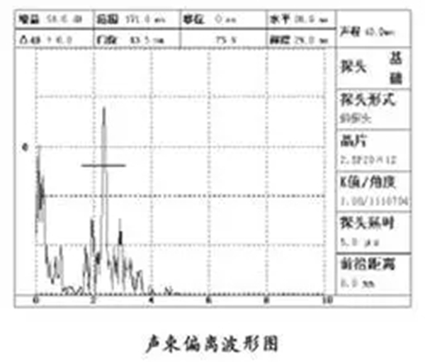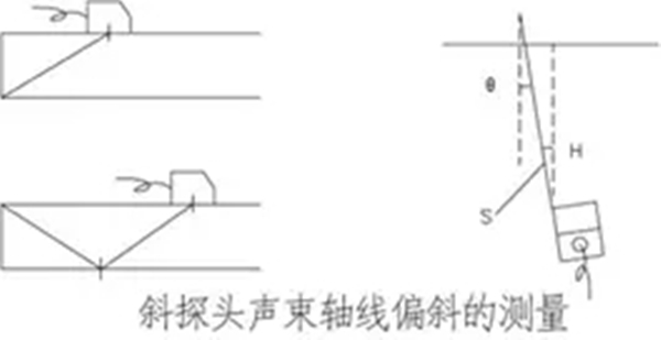 在CSK-ⅠA試塊上厚25mm的平面上,使聲束指向棱邊,對于K值小于等于1的探頭,聲束經(jīng)底面反射指向上棱角;K值大于1的聲束指向下棱角,前后左右擺動探頭,使所測棱邊端角回波幅度最高,固定探頭不動,然后用量角器或適當(dāng)?shù)姆椒y量斜探頭幾何中心聲束軸線與棱邊法線的夾角(例如測量探頭斜面與試塊端面垂直線的夾角),即為聲束軸線偏斜角。應(yīng)當(dāng)注意:斜探頭的聲束擴(kuò)散角較大時,可能影響到最大回波的探測,以致可能產(chǎn)生較大的測量誤差。